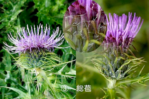 ③ 総苞は鐘~筒形で紫を帯びた緑色、わずかにクモ毛がある
