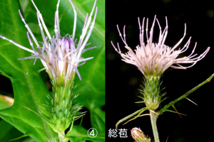 ④ 総苞は狭筒形、緑色でクモ毛はわずかにある。総苞片は